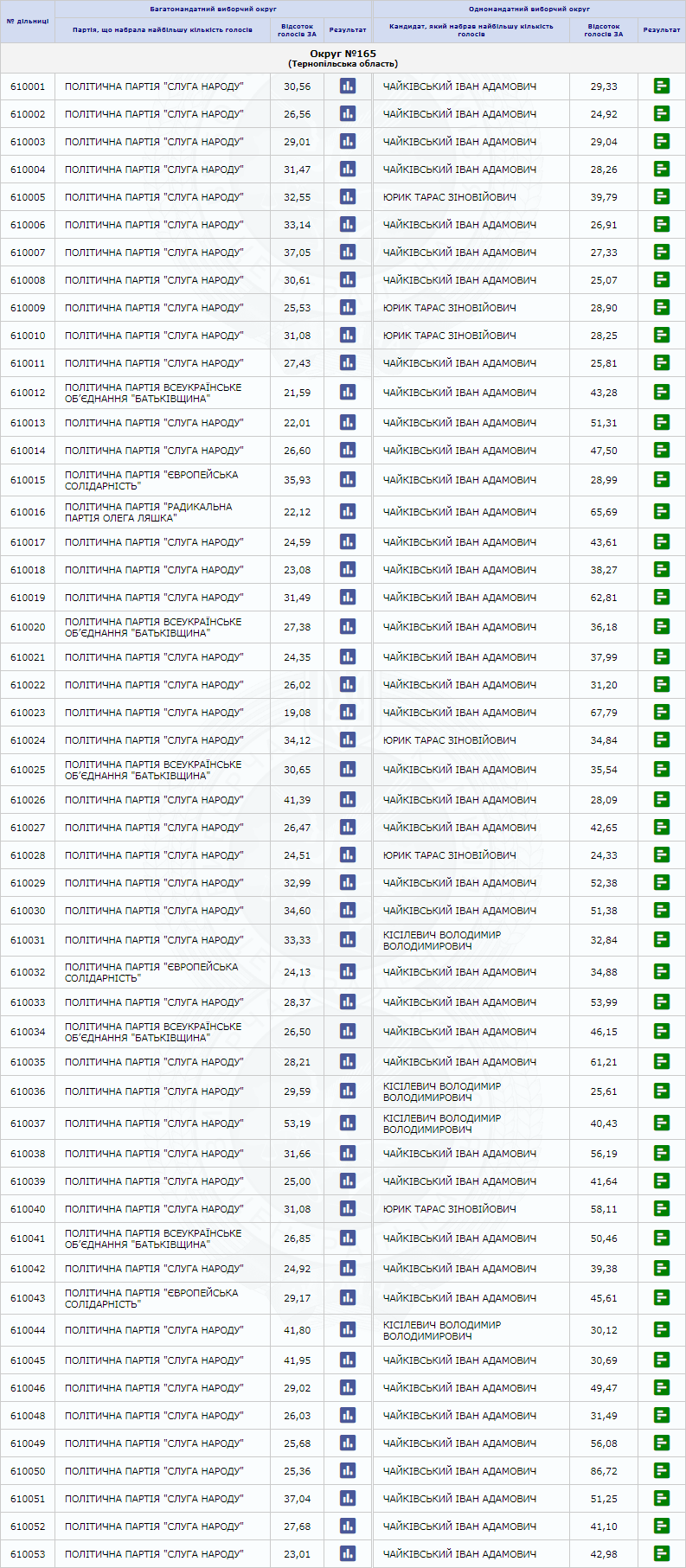 А серед мажоритарників Володимиру Кісілевичу відали перевагу на чотирьох виборчих дільницях (Надорожнів, Демня, Гутисько Рогачин) – причому в усіх випадках в тандемі партія (“Слуга народу”)-кандидат; Тарасу Юрику (“Європейська солідарність”) – на шести (Бережани – 610005 та 61009, Лісники, Куропатники, Лапшин, Рекшин). А в усіх решти – електоральні симпатії були на стороні самовисуванця Івана Чайківського.