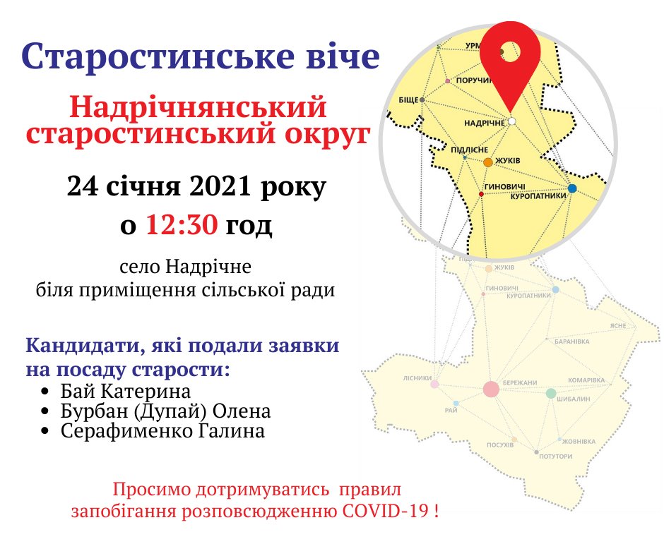 24 січня 2021 року о 12:30 в Надрічному біля адмінбудинку розпочнеться старостинське віче. Свої кандидатури на посаду очільника Надрічнянського старостинського округу запропонували: