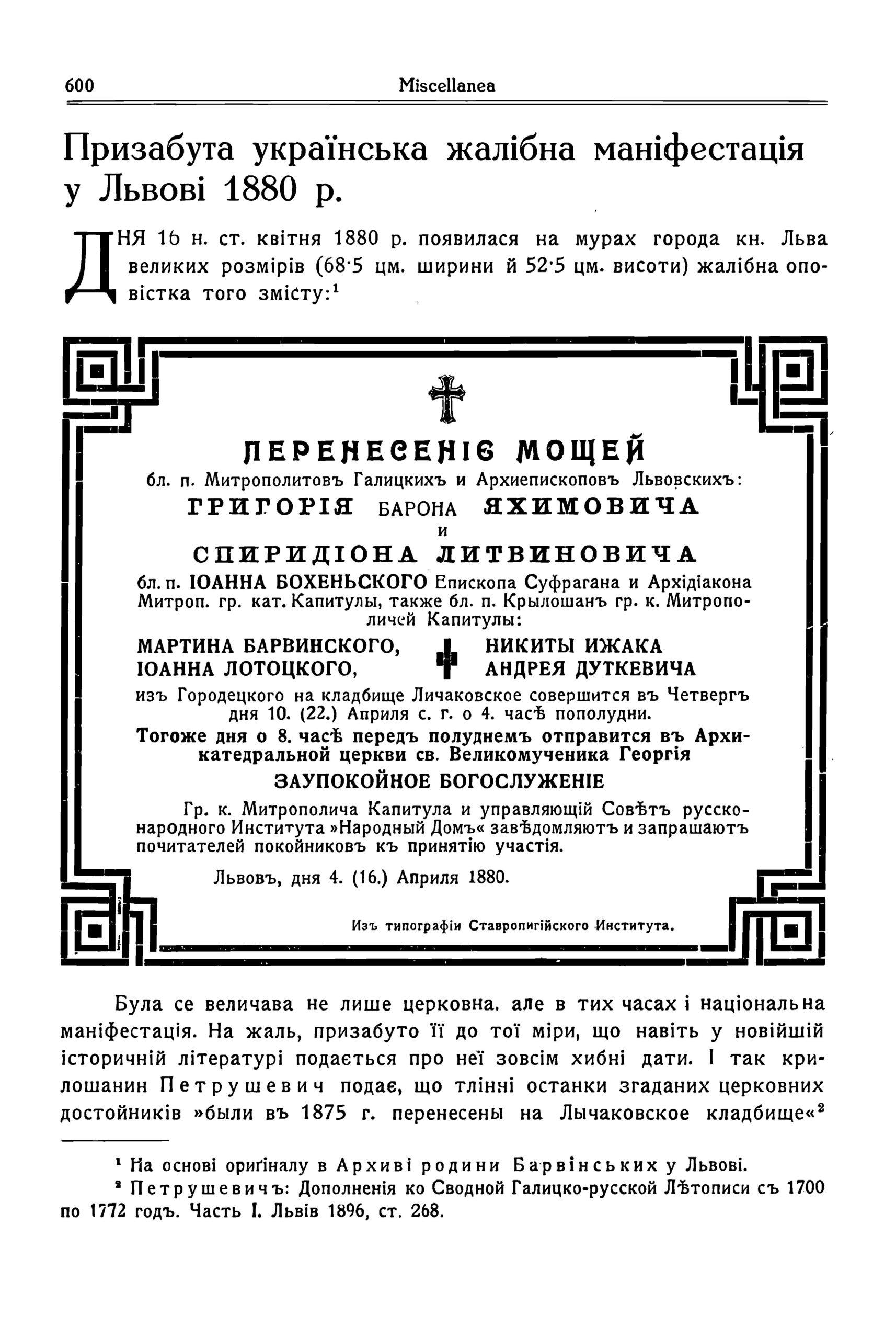 Спиридон Литвинович Призабута українська жалібна маніфестація у Львові 1880 р. nadrichne 03/02/2021 Б. Барвінський. Призабута українська жалібна маніфестація у Львові 1880 р. // Записки ЧСВВ. – Т.1. – Жовква, 1924. – С.600-602.Post navigationПопередня Призначення старост. Друга спроба /прямий ефір/Наступна На фоні костелу [Instagram] Схожі публікації Спиридон Литвинович Апостольське переємство в Українській Греко-Католицькій Церкві 18/02/2026 nadrichne Спиридон Литвинович Бориницька чудотворна ікона 10/01/2026 nadrichne Ексклюзив Спиридон Литвинович Фото Гробниця галицьких митрополитів, єпископів та крилошан 16/11/2025 nadrichne