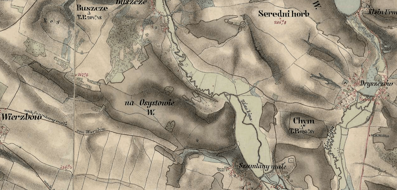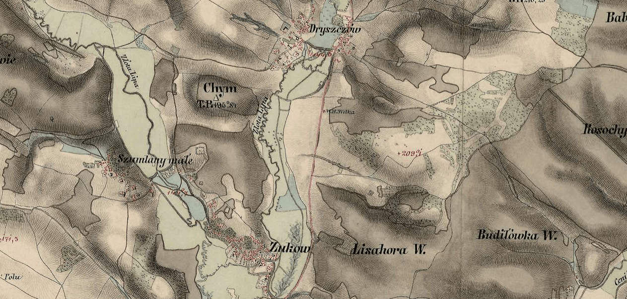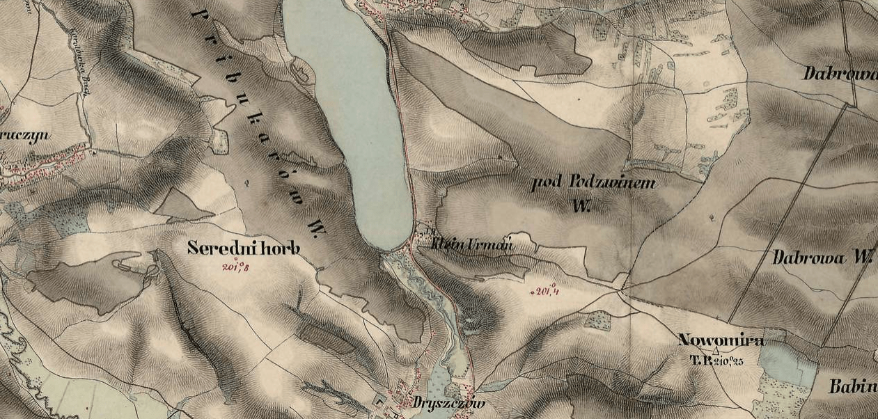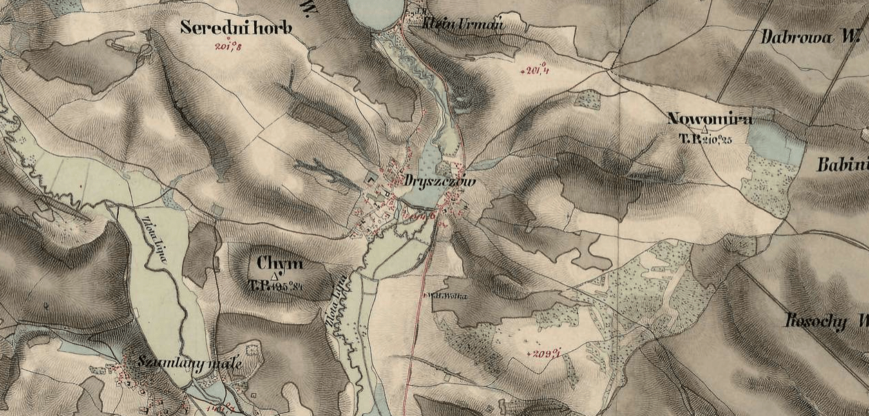 Дрищів (Dryszczow) та сусідні землі на військових топографічних картах Галичини та Буковини 1861-1864 років, виконаних на замовлення Австрійської імперії (так зване друге військове обстеження імперії Габсбургів).