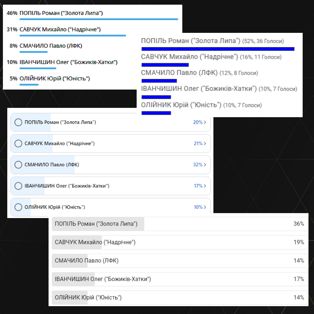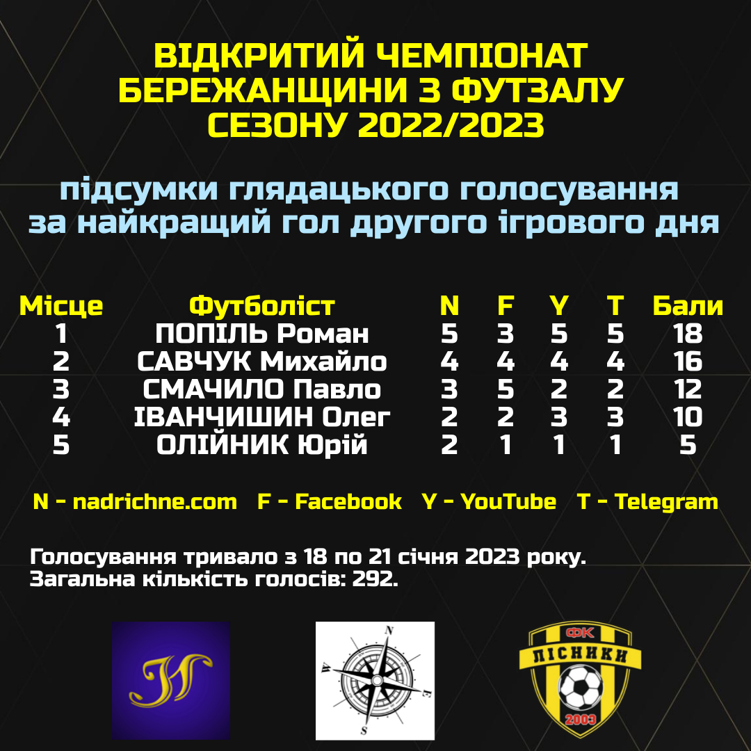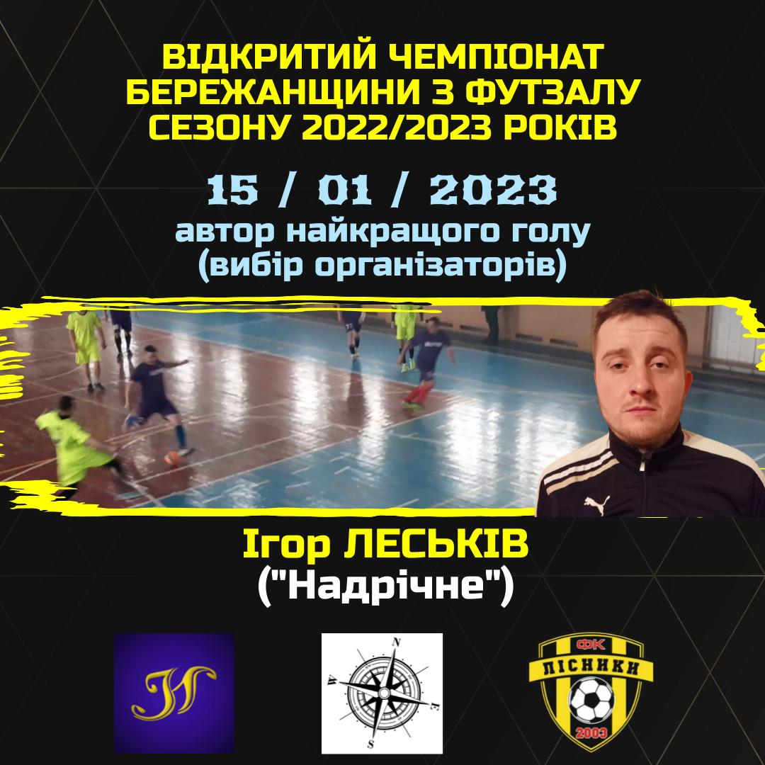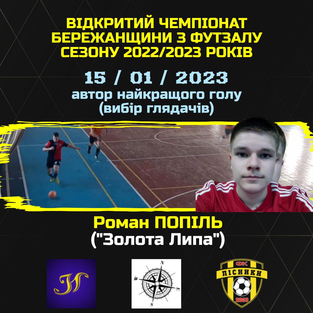 Переможцем глядацького голосування за “Найкращий гол другого ігрового дня Відкритого Чемпіонату Бережанщини з футзалу сезону 2022/2023 року” (15/01/2023) став Роман ПОПІЛЬ, який набрав 18 балів. Гравець “Золотої Липи” підібрав м’яч біля своїх воріт, пробіг правим краєм майданчика, наважився на доволі авантюрний удар, але поцілив точнісінько у дальній нижній кут воріт “Вільхівця”.