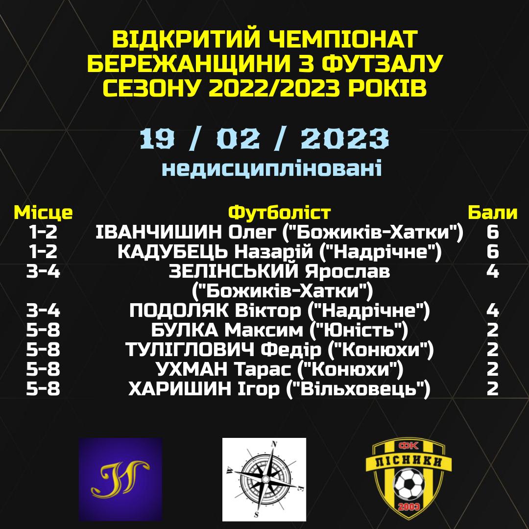 За результатами розгляду рапорту арбітра та відеозапису матчу Відкритого Чемпіонату Бережанщи з футзалу сезону 2022/2023 років між командами «Надрічне» та «Божиків-Хатки», що відбувся 12 лютого 2023 року, керуючись Регламентом Відкритого Чемпіонату Бережанщи з футзалу сезону 2022/2023 років та додатком 5 Дисциплінарних правил Української асоціації футболу,