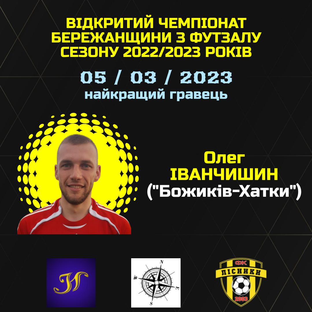 Олега ІВАНЧИШИНА вдруге визнано найкращим гравцем ігрового дня Відкритого Чемпіонату Бережанщини з футзалу сезону 2022/2023 років.