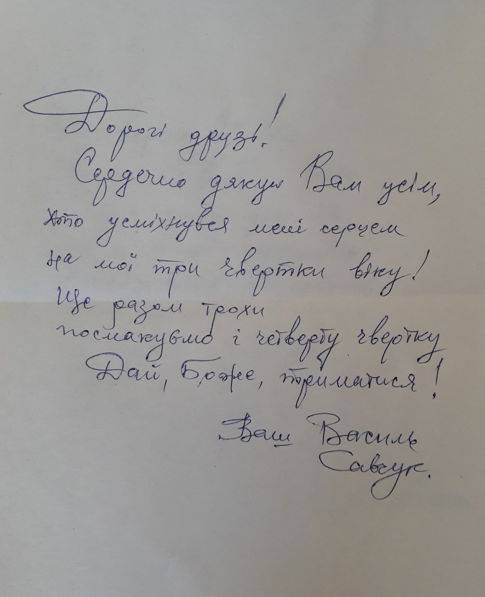 Батько народився у Великодню суботу 1944. У документах Бабуня записали день 10 квітня, бо напевне запис зробили лише згодом і точної дати не пам’ятали. Коли ще не було комп’ютерів, проте вже з’явились столітні календарі (кінець 80-х років), ми вирахували точну дату народження — 15 квітня. Відтоді ми й вітали Батька з днем народження і 10, і 15 числа. Цього року, 2023, Великодня субота вперше з 1944 знову припала на 15 квітня. До болю символічно…