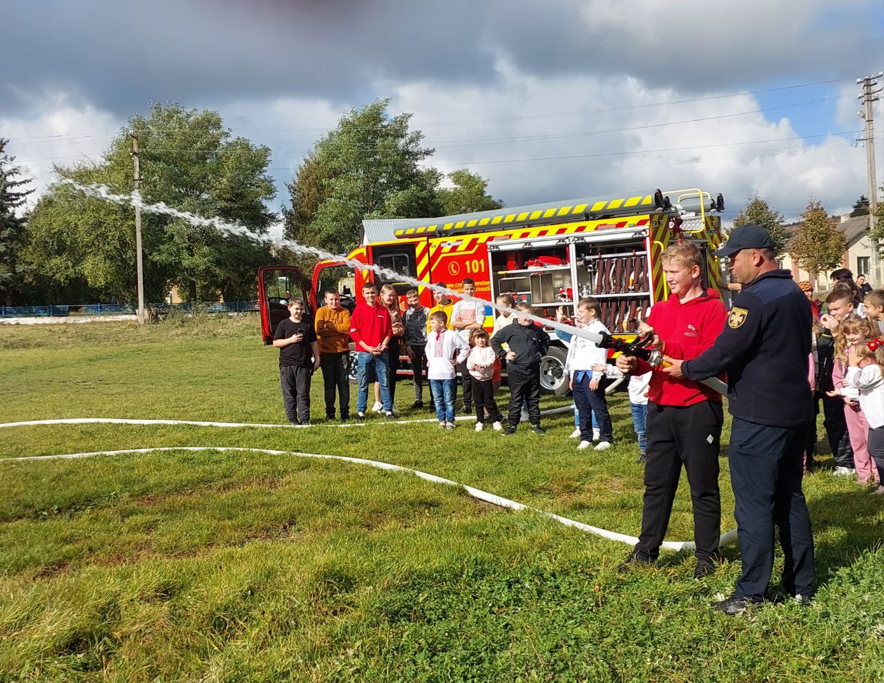 Наостанок рятувальники продемонстрували ліквідацію умовної пожежі за допомогою подачі води від пожежного автомобіля. Аби закріпити усю інформацію, яку учні отримувала протягом усієї акції, рятувальники нагадали правила безпеки життєдіяльності та пожежної безпеки.