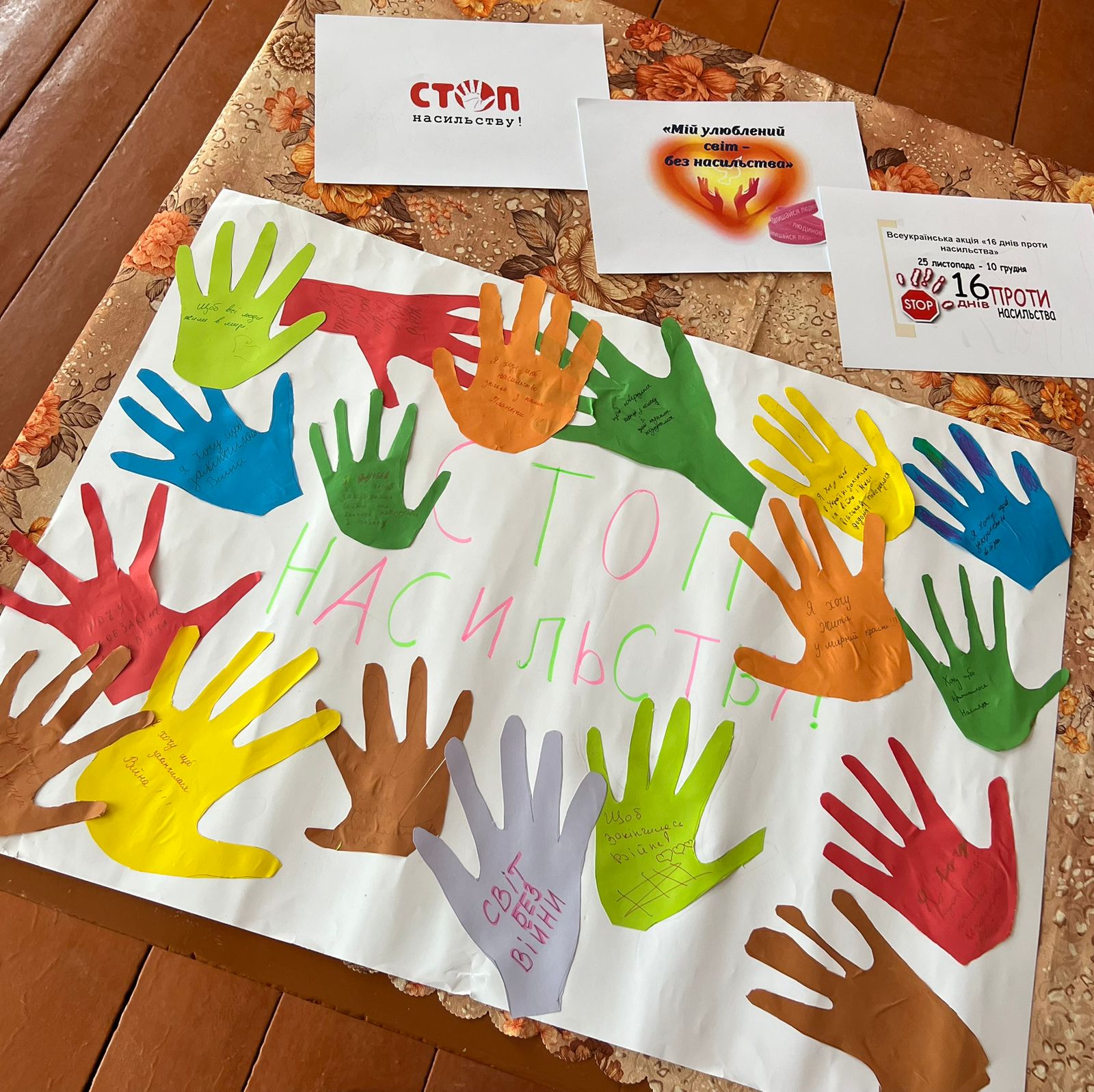 Підсумком заняття була колективна робота «Наші долоні проти насильства». Усі учні плідно попрацювали і винесли з цього тренінгу для себе висновок: у будь-якій ситуації завжди залишайся Людиною і тоді дійсно будеш щасливим.
