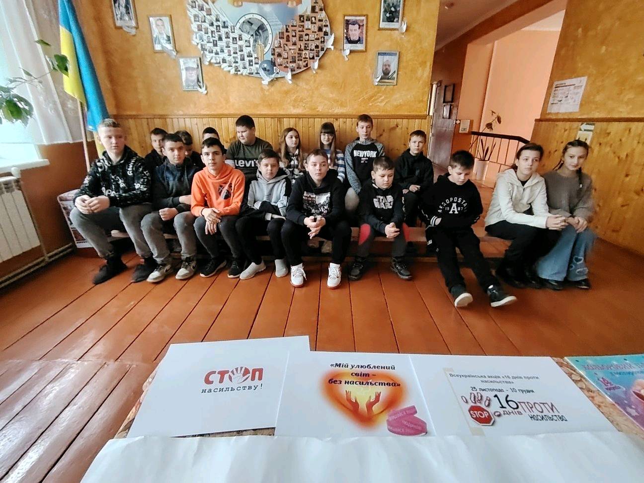 Тема заняття-тренінгу непроста і дуже актуальна: «Світ без жорстокості». Метою тренінгу було ознайомити учнів з проблемами та причинами насильства у шкільному середовищі, сім’ях, вчити не замовчувати цю проблему та бути завжди людяними і толерантними.