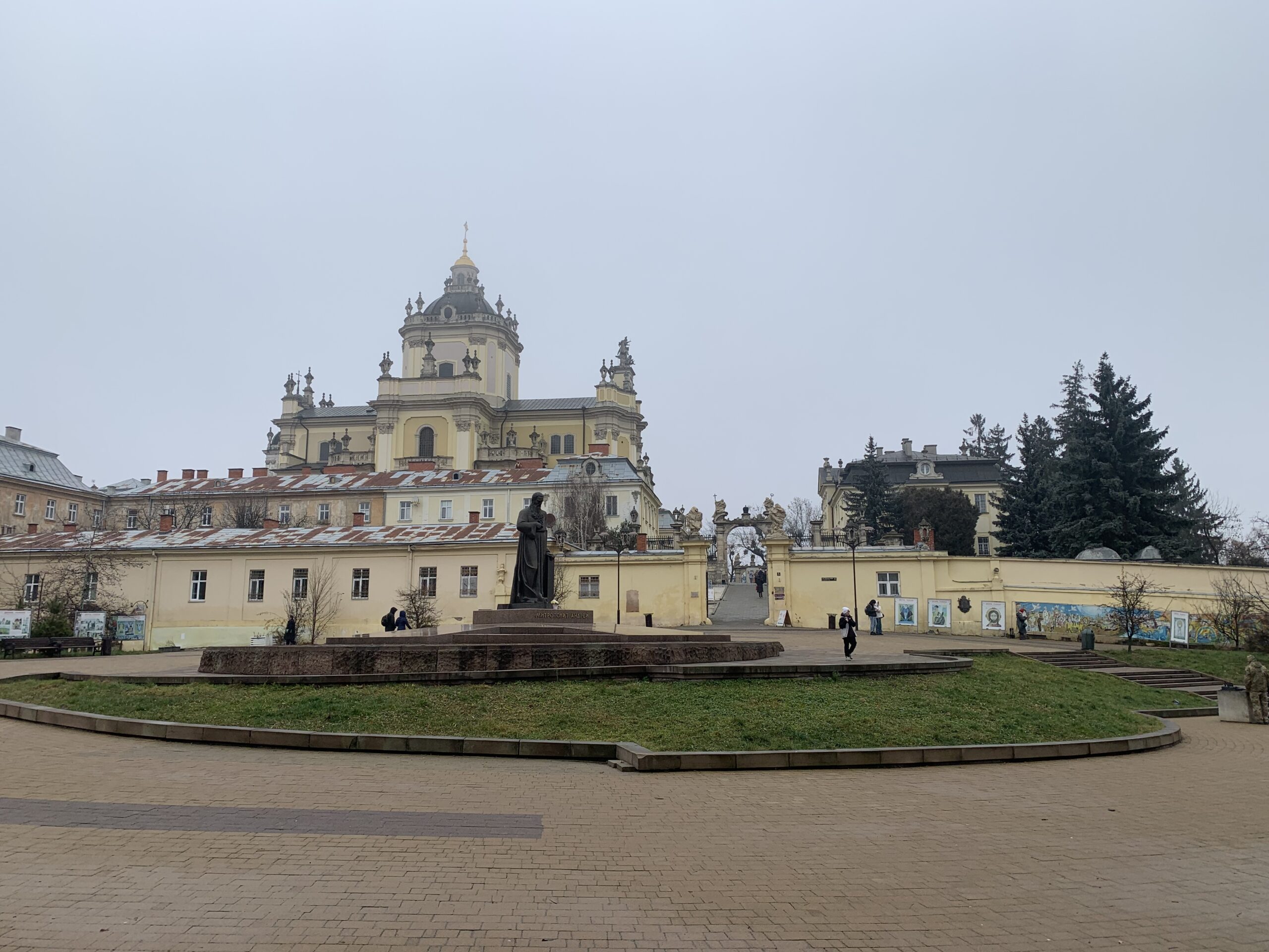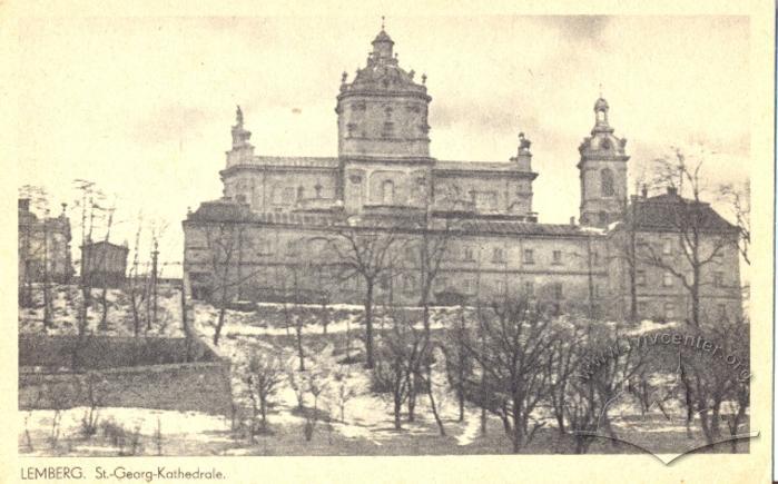 Вид собору Св. Юра з боку вулиці Петра Скарги (тепер вул. Озаркевича). На цьому місці, на верхівці одного з пагорбів серед яких лежить місто Львів, на висоті 321 м н.р.м., князь Лев (за іншою версією, його дядько князь Василько) серед букових лісів збудував первісну дерев’яну церкву та монастир св. Юра. Монастир був розташований на тому місці, де тепер стоїть будинок канцелярії. у 1364 р. будівничому Доре (Дорінгу) було доручено будову мурованої церкви. Нинішня споруда Собору св. Юра збудована в 1744–1761 рр. архітектором Бернардом Меретином (Меретіні, Мердерер) коштом єпископів Афанасія та Льва Шептицьких. Інтер’єри Собора св. Юра декоровані Клеменсом Фесінгером; стінні розписи виконував Лука Долинський; на стінах церкви – портрети архієпископів Шептицького, Ангеловича, Левицького, Яхимовича, Литвиновича. Зовнішнє оздоблення, браму з алегоричними фігурами виконував Михайло Філевич; аттик увінчує статуя св. Юрія Змієборця авторства Йогана Георга Пінзеля.