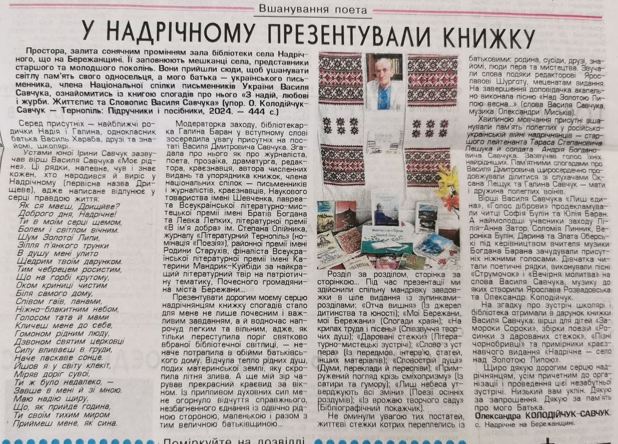 Василь Савчук Фото «Вільне життя плюс»: “У Надрічному презентували книжку” nadrichne 07/08/2025 Газета «Вільне життя плюс». 2025 рік. 6 серпняPost navigationПопередня Яблучний Спас – 2025Наступна Успіння Пресвятої Богородиці (2025) Схожі публікації Відео Ексклюзив Свято Фото Церква Великдень (2026) 12/04/2026 nadrichne Костел Фото Здається, ніби час тут зупинився 11/04/2026 nadrichne Відео Ексклюзив Фото Церква Плащаниця (2026) 10/04/2026 nadrichne