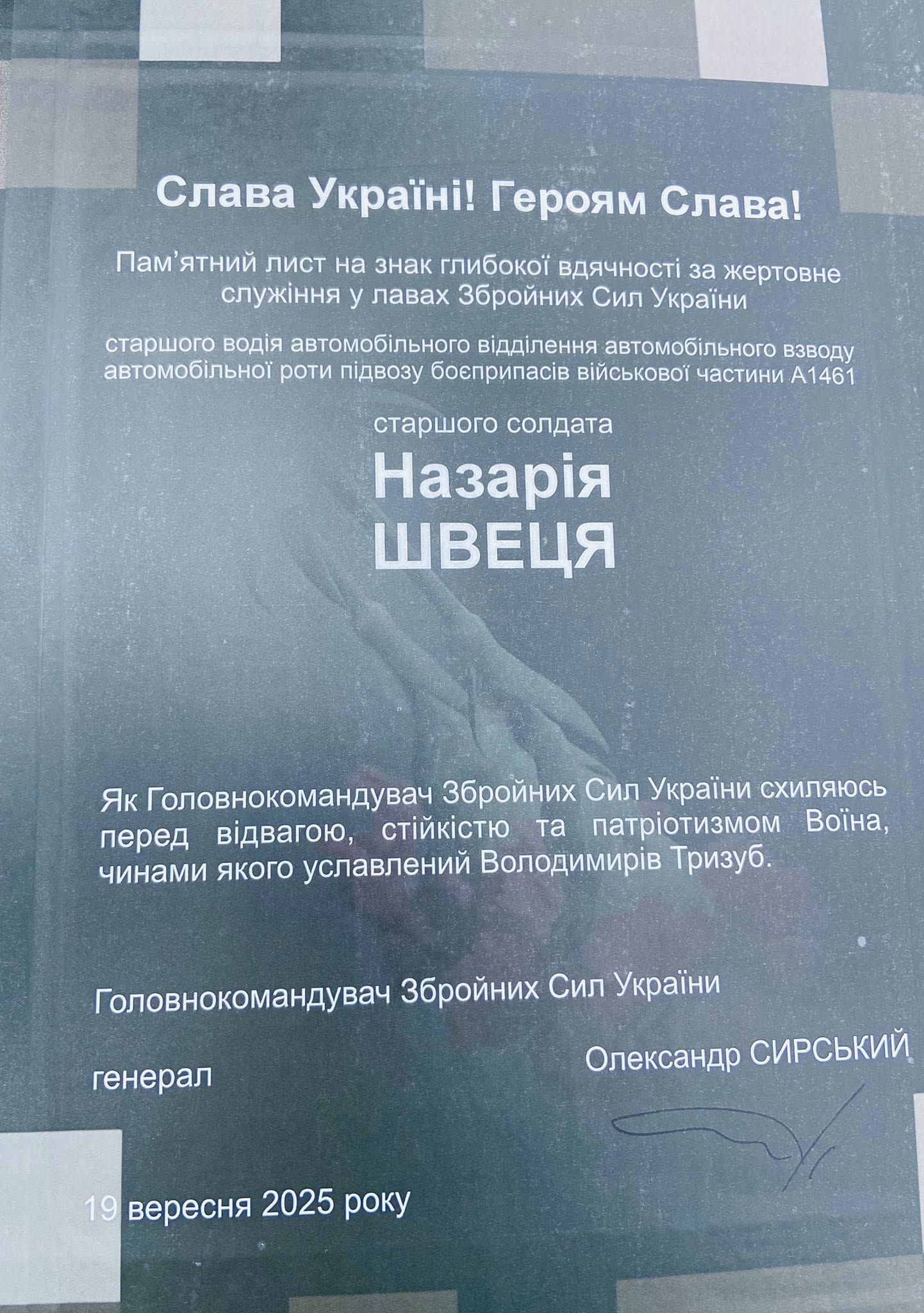 Старший солдат ШВЕЦЬ Назарій Васильович (01.02.1996 р. – 17.09.2025 р.), старший водій 1 автомобільного відділення 1 автомобільного взводу автомобільної роти підвозу боєприпасів військової частини А1461 відійшов у вічність 17 вересня 2025 року.